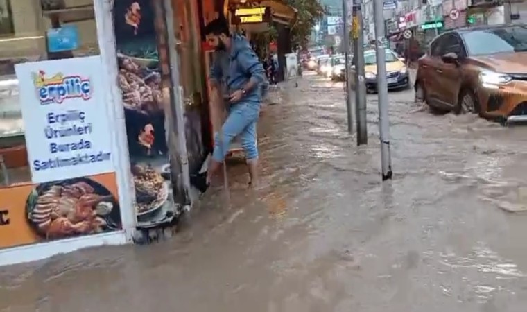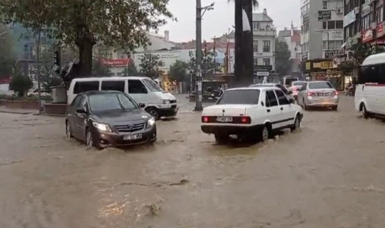 Balıkesir’in Edremit ilçesinde 5 dakikalık sağanak yağış hayatı felç etti. Yollar göle döndü, meydan sular altında kaldı. Ana caddeler çaya dönüşürken, çok sayıda işyerini su bastı.