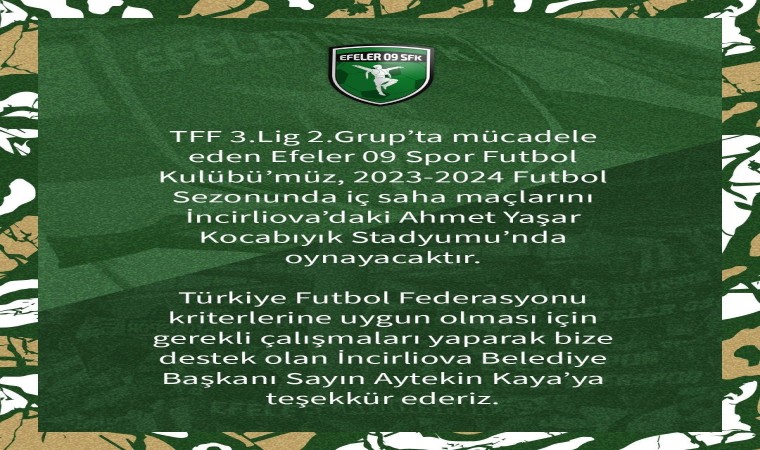 Efeler 09 SFK Yönetim Kurulu tarafından yapılan açıklamada, "Türkiye Futbol Federasyonu kriterlerine uygun olması için gerekli çalışmaları yaparak bize destek olan İncirliova Belediye Başkanı Aytekin Kaya’ya teşekkür ederiz" ifadelerine yer verildi. Yeşil beyazlı ekip, ilk iç saha maçını 17 Eylül Pazar günü oynayacak.