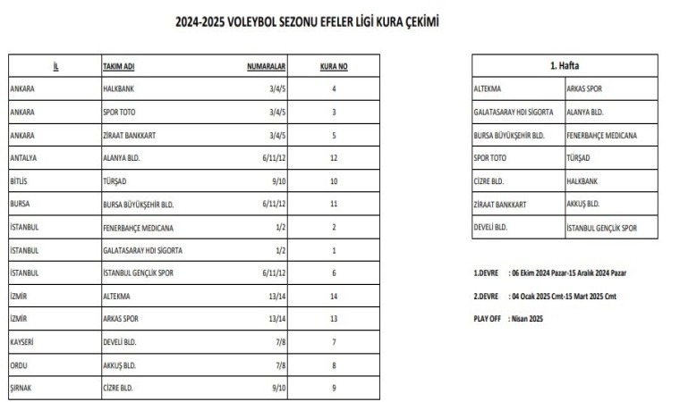 Efeler Ligi’nde 2024-2025 voleybol sezonunun fikstür çekimi, Türkiye Voleybol Federasyonu’nun Ankara Merkez Ofisi’nde yapıldı. Türkiye Voleybol Federasyonu’nun resmi sosyal medya kanalından yayınlanan kura çekimini, TVF Genel Sekreteri Av. Nihal İşçi, TVF Lig İşleri Danışmanı Recep Nurtanış ve TVF lig İşleri Görevlisi Ebru Ezgi Alper gerçekleştirdi. Yeni sezonda yoluna Efeler Ligi’nde mücadele edecek olan Develi Belediyespor’un rakipleri ve fikstürü belli oldu. Efeler Ligi’nde 1. devre karşılaşmaları 6 Ekim - 15 Aralık 2024 tarihleri arasında, 2. devre karşılaşmaları 4 Ocak - 15 Nisan 2025 tarihleri arasında oynanacak. Yeni sezon hazırlıklarına başlayan Develi Belediyespor, sezonun ilk maçına deplasmanda çıkacak. Kayseri ekibi Develi Belediyespor Efeler Ligi’nde Altekma, Arkas Spor, Galatasaray HDI Sigorta, Alanya Belediyespor, Bursa BBSK, Fenerbahçe Medicana, Spor Toto, Türşad, Cizre Belediyespor, Halkbank, Ziraat Bankkart, Akkuş Belediyespor ve İstanbul Gençlik Spor takımları ile mücadele edecek.
