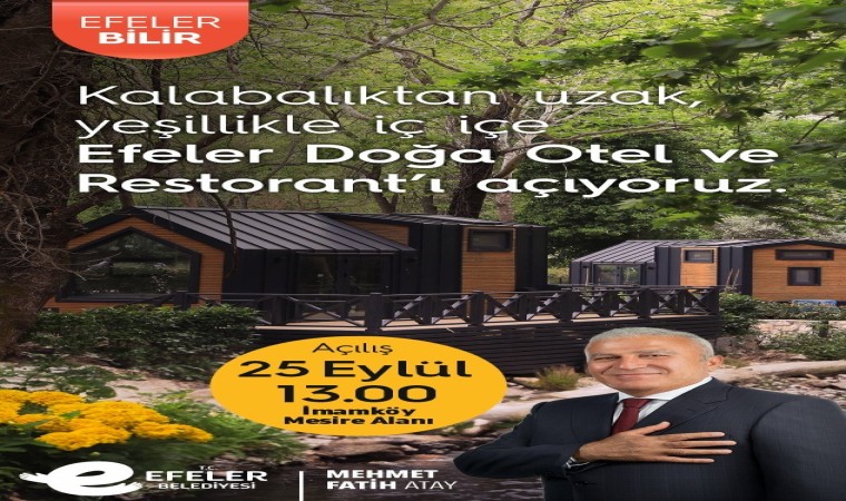 Efeler Belediye Başkanı Mehmet Fatih Atay, temel belediyecilik hizmetlerinin yanı sıra kentte hayata geçirdiği sosyal projelerle de vatandaşlardan beğeni topluyor. Efeler halkına çok sayıda yaşam alanı kazandıran Başkan Atay, çalışmalarına bir yenisini daha ekledi. Efeler’de turizm sektörünün canlanması, Kuşadası ve Didim gibi bölgelere giden yabancı turistleri ilçeye yönlendirmek ve alternatif bir tatil olanağı sunmak için yapımı tamamlanan Doğa Otel ve Restaurant, 25 Eylül Pazartesi günü saat 13.00’te İmamköy Mesire Alanı’nda düzenlenecek törenle hizmete sunulacak.