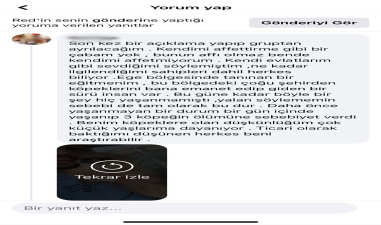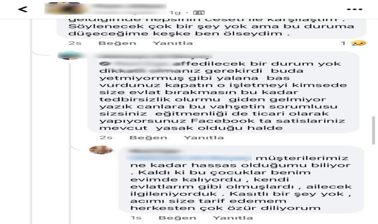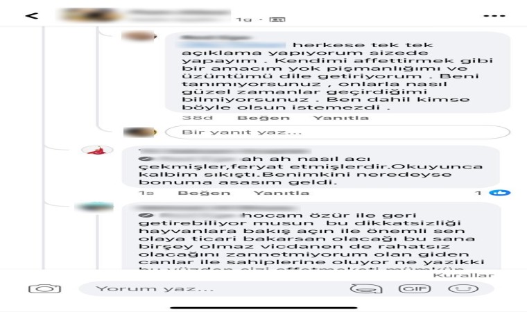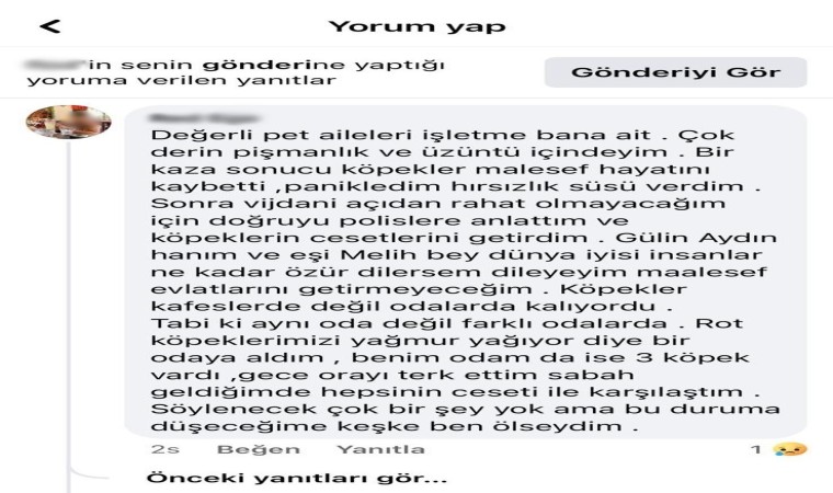 "Köpeklerimiz bizim çocuklarımız gibiydi. Düşünün bir çocuğunuz var ve kreşe veriyorsunuz. Sizi arıyorlar ve diyorlar ki çocuklarınız öldü. Bu durumda ne düşünür ve ne yaparsınız? Bu kadar ihmalkarlık olmaz. Büyük ırklarla küçük ırkların yan yana getirilmeyeceğini herkes bilir. Bana 8-10 yıldır bu işi yaptığını söyledi. Bu kadar yıldır bir insanın deneyim kazanması lazım, sorumluluk sahibi olur. Yaşanan olay istemeyerek de olsa bunun tedbirini almak zorundaydı ve sorumluluk kendisindeydi. Gözümüzün içine baka baka yalan söyledi. Kendisini hiç bir zaman affetmeyeceğim."