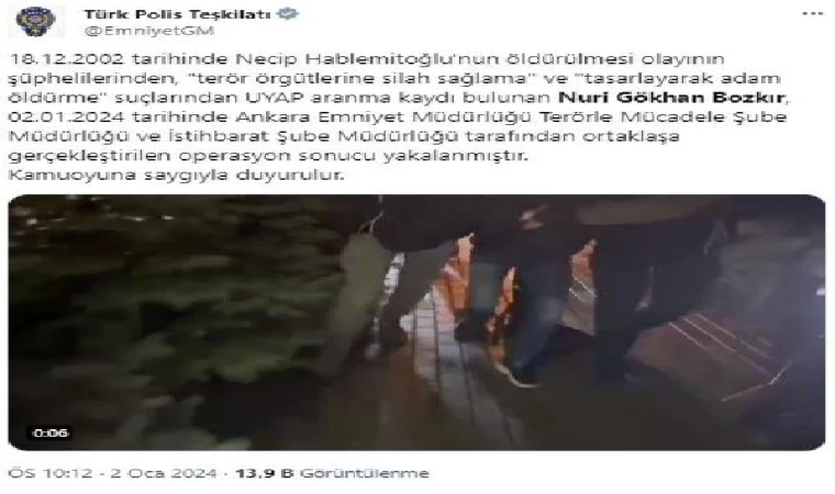 EGM’nin sosyal medya hesabından yapılan açıklamada, "18.12.2002 tarihinde Necip Hablemitoğlu'nun öldürülmesi olayının şüphelilerinden, 'terör örgütlerine silah sağlama' ve 'tasarlayarak adam öldürme' suçlarından Ulusal Yargı Ağı Bilişim Sistemi (UYAP) aranma kaydı bulunan Nuri Gökhan Bozkır, 02.01.2024 tarihinde Ankara Emniyet Müdürlüğü Terörle Mücadele Şube Müdürlüğü ve İstihbarat Şube Müdürlüğü tarafından ortaklaşa gerçekleştirilen operasyon sonucu yakalanmıştır. Kamuoyuna saygıyla duyurulur" denildi. (DHA)