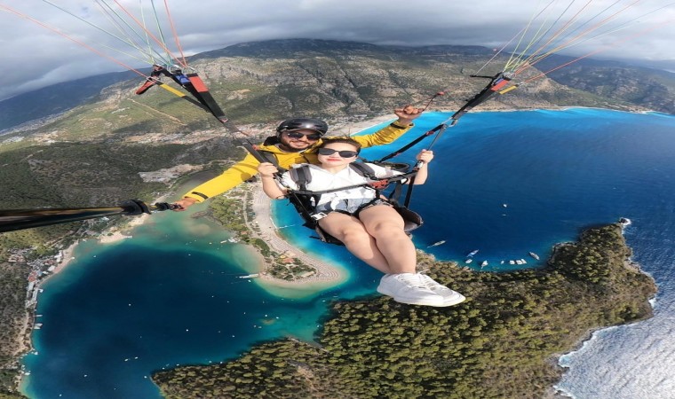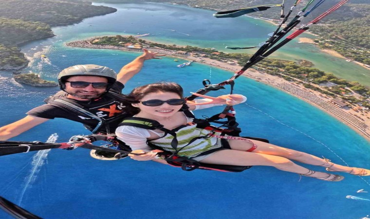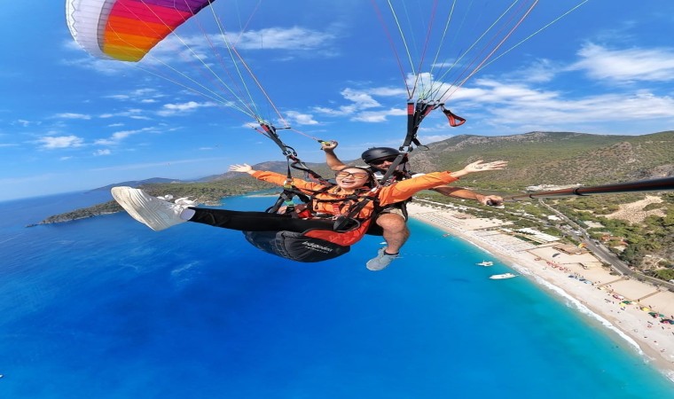 Tatillerini Fethiye’de değerlendiren Çinli turistler, Ölüdeniz’in eşsiz manzarasında yamaç paraşütü yaparak adrenalin dolu anlar yaşadı.