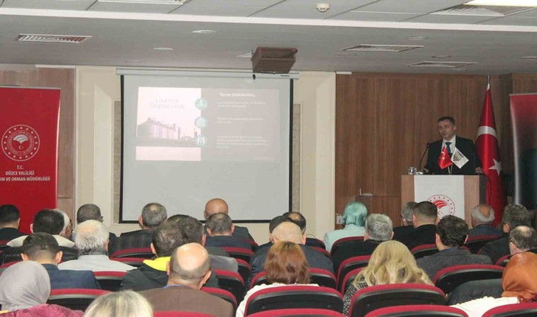 Düzce’de, lisanslı depoculuk konusunda bilgilendirme toplantısı düzenlendi. Toplantının açılış konuşmasını yapan Düzce Tarım ve Orman İl Müdürü Esra Uzun, lisanslı depoculuk sisteminin önemine vurgu yaptı. Uzun, "Bu toplantının amacı, depoculuk sektörünün gelişimine katkı sağlamak, üreticilerimizin ve tüccarlarımızın ihtiyaçlarını karşılamak ve tarım ürünlerinin güvenli depolanmasını sağlamaktır. Lisanslı depoculuk, ürünlerin kaliteli ve güvenli bir şekilde muhafaza edilmesini temin ederken, aynı zamanda üreticilere ve tüccarlara ekonomik fayda sağlamaktadır. Düzce ilimiz, tarım ve ticaret alanında önemli bir potansiyele sahiptir. Lisanslı depoculuk sistemi, bu potansiyeli daha da artırmak için önemli bir adımdır" ifadelerinde bulundu.