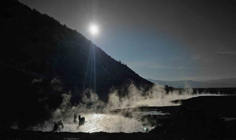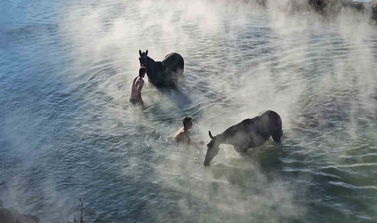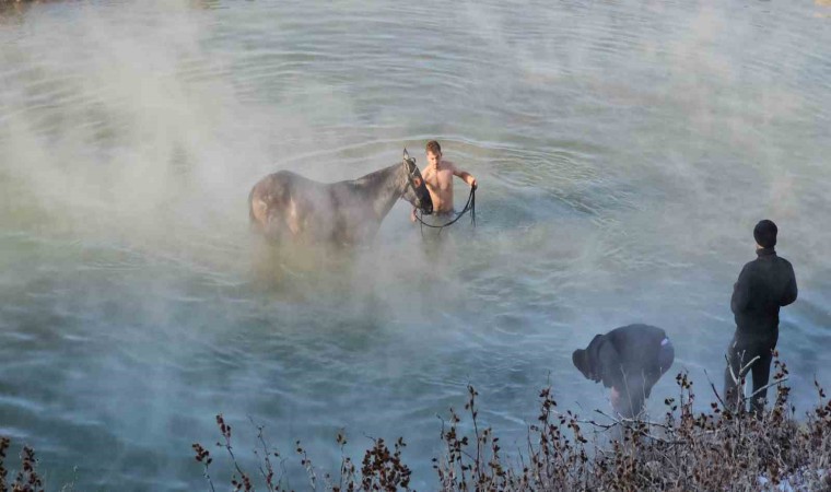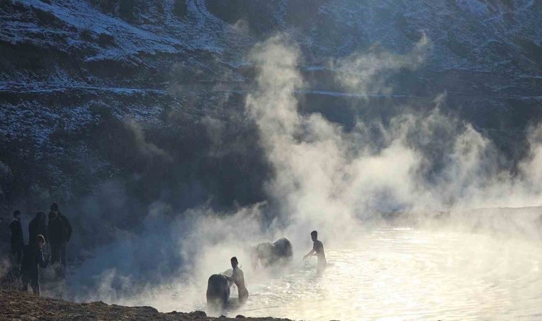 Bitlis’in Güroymak ilçesine bağlı Budaklı köyünde eksi 15 dereceyi bulan havaya aldırış etmeyen köylüler, atlarını doğal kaplıca suyunda yıkıyor.