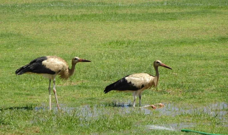Sarılar futbol sahasındaki görevlinin hortumla su sıkması karşısında suyun altına koşan leylekler, hortumun yere bırakılmasıyla birlikte suyun toplandığı yerde serinlemenin keyfini yaşadı.
