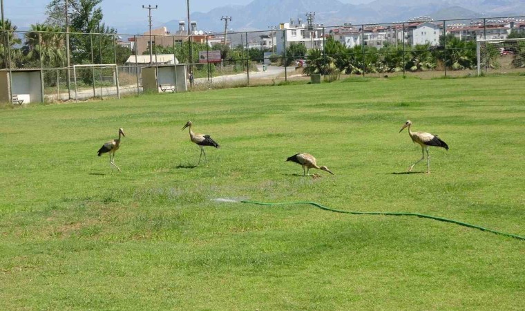 Türkiye genelinde etkili olan ‘El Nino’ sıcakları Antalya’nın Manavgat ilçesinde de etkili oluyor. Mevsim normallerinin üzerinde seyreden sıcaklığın daha da artmasıyla sıcaktan sadece insanlar değil hayvanlar da etkilendi. Daha önce bir elektrik direğini mekan edinen leylekler, bu yıl dünyaya gelen 2 yavrularıyla birlikte sıcağın etkisinden kurtulabilmek için Sarılar futbol sahasında çimlerin sulanmasını fırsat bildi.