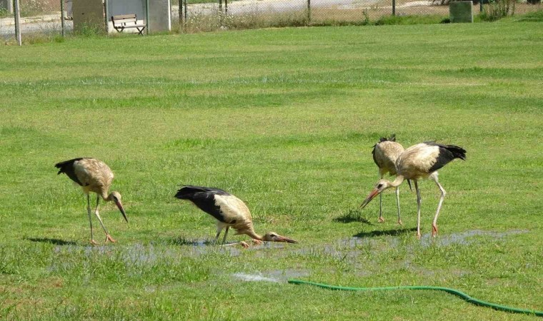 Sarılar Mahallesi’nde uzun yıllardır Şelale yolu üzeri Hüseyin Efendi Caddesi’nde elektrik direğine yuva kuran leylekler, bunaltıcı sıcaktan korunmanın yolunu Sarılar futbol sahasında buldu. Futbol sahasına gelen anne-baba ve bu yıl dünyaya gelen 2 yavrudan oluşan leylek ailesi, sahanın çimleri arasında solucan başta olmak üzere yiyecek ararken, sıcağın etkisinden yakınlarına kadar insanların yaklaşmasını umursamıyor.
