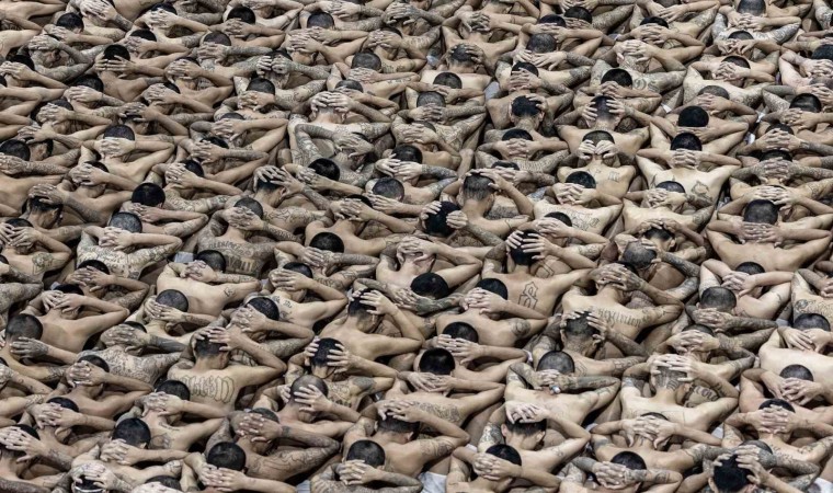 Paylaşılan görüntülerde saçları kazınmış, dövmeli ve beyaz şortlu çete üyelerinin elleri arkadan kelepçeli şekilde dev hapishaneye götürüldüğü anlar yer aldı.