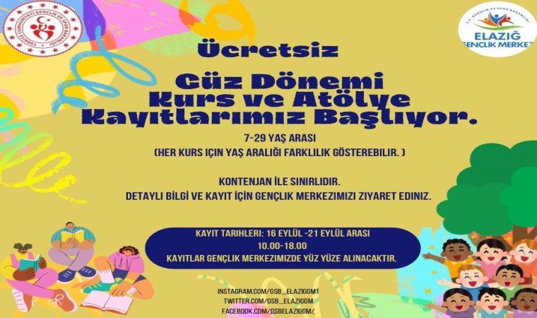 Elazığ Gençlik ve Spor İl Müdürlüğü’ne bağlı gençlik merkezlerinde toplam 22 branşta güz dönemi kurs başvuruları 16 Eylül’de başladı. Akademik, sosyal ve müzik alanlarında verilecek olan kurslara 16-21 Eylül tarihleri arasında 7-29 yaş aralığında bulunan tüm vatandaşlar gençlik merkezlerine giderek yüz yüze başvuru yapabilecek.