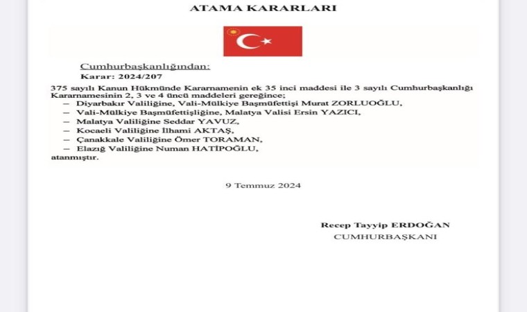 Cumhurbaşkanı Recep Tayyip Erdoğan imzasıyla, Resmi Gazete’de yayımlanan kararlara göre, Diyarbakır Valiliğine Murat Zorluoğlu, Vali-Mülkiye Başmüfettişliğine Malatya Valisi Ersin Yazıcı, Malatya Valiliğine Seddar Yavuz, Kocaeli Valiliğine İlhami Aktaş, Çanakkale Valiliğine Ömer Toraman ve Elazığ Valiliğine ise Numan Hatipoğlu atandı.