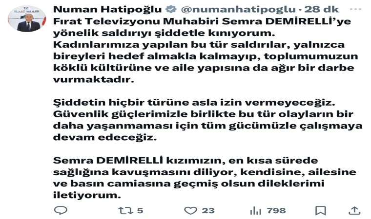 Elazığ Valisi Numan Hatipoğlu, yaptığı açıklamada, "Fırat Televizyonu Muhabiri Semra Demirelli’ye yönelik saldırıyı şiddetle kınıyorum. Kadınlarımıza yapılan bu tür saldırılar, yalnızca bireyleri hedef almakla kalmayıp, toplumumuzun köklü kültürüne ve aile yapısına da ağır bir darbe vurmaktadır. Şiddetin hiçbir türüne asla izin vermeyeceğiz. Güvenlik güçlerimizle birlikte bu tür olayların bir daha yaşanmaması için tüm gücümüzle çalışmaya devam edeceğiz. Semra Demirelli kızımızın, en kısa sürede sağlığına kavuşmasını diliyor, kendisine, ailesine ve basın camiasına geçmiş olsun dileklerimi iletiyorum" dedi.