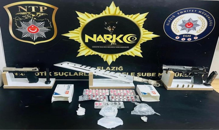 Elazığ Cumhuriyet Başsavcılığı koordinesinde İl Emniyet Müdürlüğü Narkotik Suçlarla Mücadele Şube Müdürlüğü ekipleri tarafından, uyuşturucu ile mücadele çerçevesinde, uyuşturucu ve uyarıcı madde ticareti, kullanımı ve sevkiyatının engellenmesine yönelik çalışma gerçekleştirilpdi. Çalışmada, 8 adet suç kaydı bulunan İ.C. (34) ile 19 suç kaydı bulunan K.D. (29) isimli şahısların yapılan üst aramasında 2,42 gram metamfetamin, 0,26 gram kokain ele geçirilmiş, şahısların ikamet adresinde yapılan aramasında ise 22 adet Lyrca sentetik ecza maddesi, 20 adet symra sentetik ecza maddesi, 6,03 gram metamfetamin maddesi, 1 adet pala isimli kesici alet, 2 adet ruhsatsız tabanca ve tabancalara ait 4 adet fişek ele geçirildi.