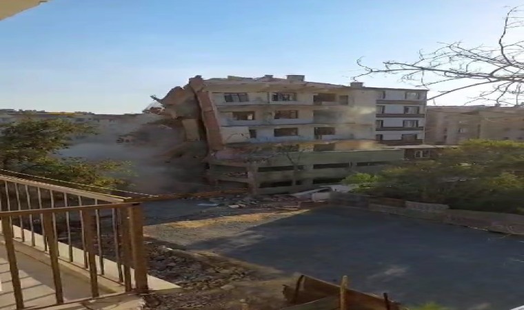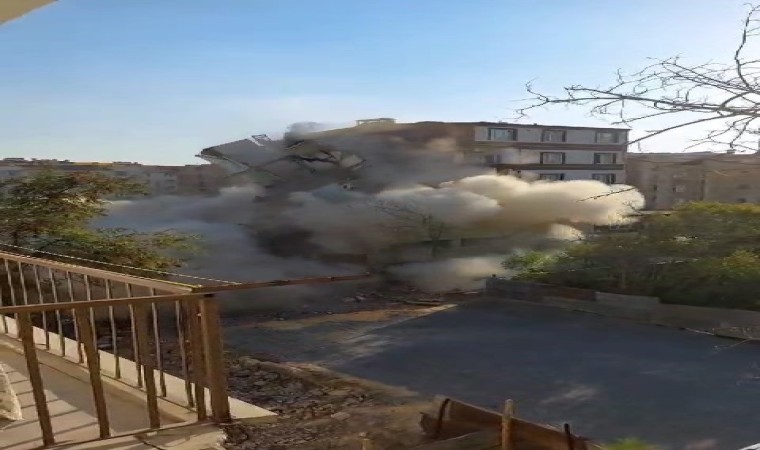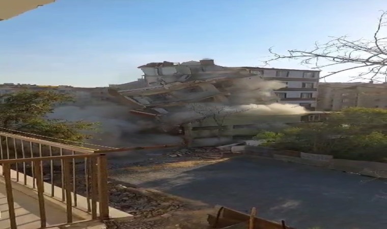 6 Şubat’ta Kahramanmaraş’ta meydana gelen yıkıcı depremlerden etkilenen iller arasından bulunan Elazığ’da ağır hasarlı binaların yıkımı devam ediyor. Bu çerçevede, merkeze bağlı Nailbey Mahallesi’nde yıkımına başlanan 5 katlı bina, iş makinesinin vurmasıyla bir anda yerle bir oldu.