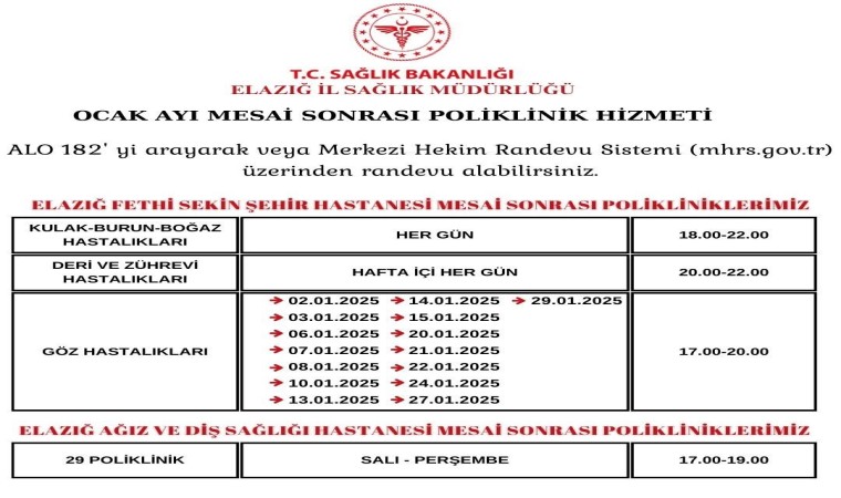 Mesai sonrası poliklinik hizmeti sunacak branşların hizmet gün ve saatlerinin hastanelerin internet siteleri ve sosyal medya hesaplarından da takip edilebileceğini belirten Dr. Emrah Gecekuşu, ’’2025 Ocak ayı itibariyle Ağız ve Diş Sağlığı Hastanemiz her hafta salı ve perşembe günleri 17.00-19.00 saatleri arasında 29 poliklinik ile vatandaşlarımıza genel diş sağlığı hizmeti vermeye başladı. Sağlık hizmetlerine erişimi kolaylaştırmak öncelikli hedeflerimiz arasındadır. Fethi Sekin Şehir Hastanemizde mesai dışı poliklinik hizmetlerini zaten uzun bir zamandır sunuyorduk. Kulak burun boğaz ve cildiye poliklinikleri hafta içi her gün, göz hastalıkları polikliniğimiz ise yine hafta içi belirli günlerde mesai saatleri dışında halihazırda hizmet vermeye devam ediyordu. Diş hastanesi polikliniklerinin da eklenmesiyle sunmuş olduğumuz hizmet yelpazemizi genişletmiş olduk. Vatandaşlarımız Alo 182 çağrı merkezini arayarak ya da Merkezi Hekim Randevu Sistemi mobil uygulaması üzerinden polikliniklerimize randevularını alabilirler. Uygulamanın ilimize faydalı olmasını temenni ediyor, hastalarımıza acil şifalar diliyorum” ifadelerini kullandı.