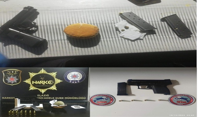Elazığ’da polis ekipleri tarafından sürdürülen asayiş uygulamalarında 2 parça halinde toplam 106 gram toz esrar maddesi ve 2 adet ruhsatsız tabanca ele geçirildi.