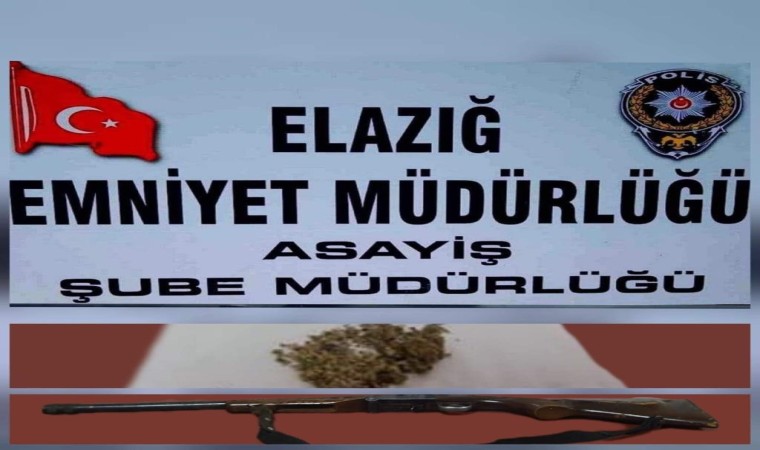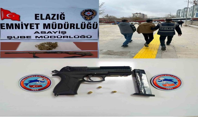 Elazığ Cumhuriyet Başsavcılığı Koordinesinde İl Emniyet Müdürlüğü tarafından genel güvenlik ve genel asayişin sağlanması, suça konu unsurların tespiti ve şüpheli şahısların yakalanmasına yönelik çalışma gerçekleştirildi. Yapılan çalışmalarda 1 adet ruhsatsız tabanca ve tabancaya ait 3 adet fişek, 1 adet tüfek, 2 şahıstan bir miktar esrar maddesi ele geçirildi. Şüpheli şahıslar ve suç unsurları hakkında adli işlem başlatıldı.