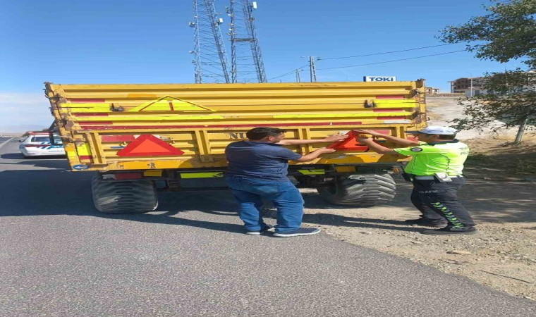 Elazığ’da hasat mevsiminin devam etmesiyle birlikte polis ekipleri, traktör römorklarına reflektör takarak uyarılarda bulundu.