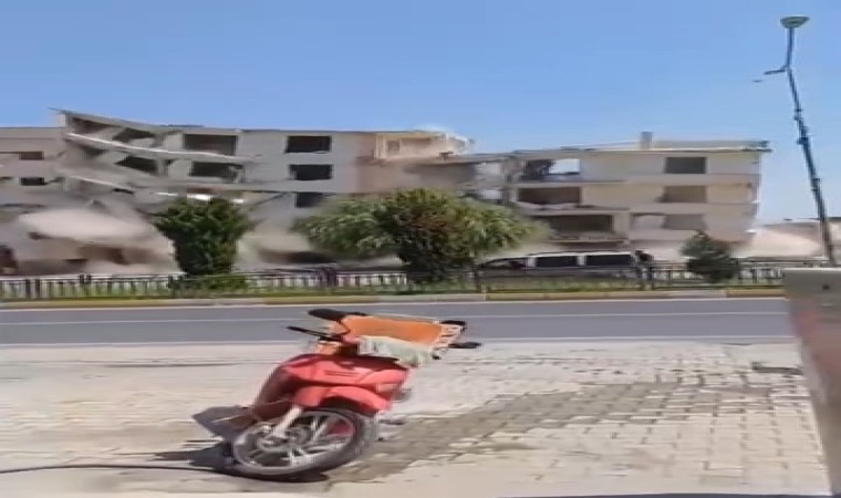 Kahramanmaraş merkezli depremlerde Elazığ’da ağır hasar gören bina, iş makinesinin dokunmasıyla yerle bir oldu. Yıkım esnasında caddenin trafiğe kapatılmaması ve araçların yıkım esnasında yoldan geçmesi yürekleri ağza getirdi.