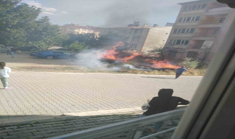 Elazığ’ın Karakoçan ilçesinde bir binanın önünde bulunan kurumuş otlarla kaplı alanda henüz bilinmeyen bir nedenle yangın çıktı. Çevredekilerin büyük panik yaşadığı yangın, ekiplerin kısa süredeki müdahalesi ile evlere sıçramadan söndürüldü.