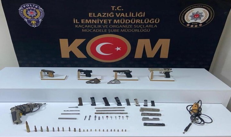 Elazığ Cumhuriyet Başsavcılığı koordinesinde, İl Emniyet Müdürlüğü Kaçakçılık ve Organize Suçlarla Mücadele Şube Müdürlüğü tarafından, silah ticareti ve kaçak atölye olarak kullanılan iş yeri bilgisine istinaden çalışma gerçekleştirildi. Yapılan çalışmalarda A.B. (44) ve O.Ç. (30) isimli şahıslara ait 2 farklı iş yerinde yapılan aramada 4 adet ruhsatsız tabanca, 22 adet farklı silah fişeği (Bixi, G3, M16 ve tabanca ) 10 adet tabanca yapımında kullanılan tertibat, 8 adet tabanca şarjörü, 1 adet tabanca namlusu açmaya yarayan matkap, 1 adet taşlama makinesi, 7 adet yiv-set yapımında kullanılan elmas uç, 6 adet taşlama ucu ele geçirildi.