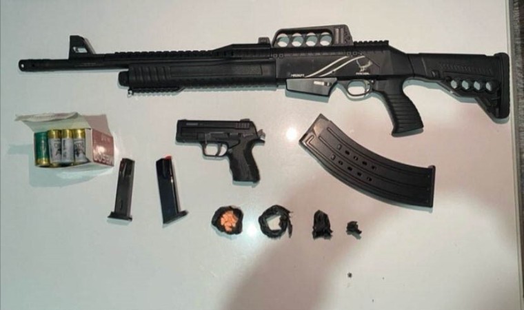 Yapılan kontrollerde, hırsızlık suçundan 20 yıl kesinleşmiş hapis cezası olan 1 şahıs yakalanırken 25 gram kokain, 11 adet extasy hap, 1 adet pompalı tüfek ve 12 adet dolu kartuş, 3 adet ruhsatsız tabanca, 4 adet fişek ele geçirildi.
