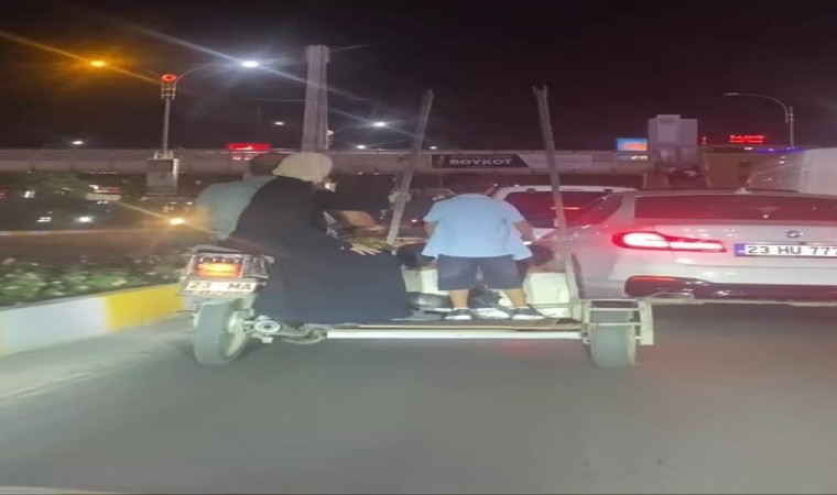 Elazığ’da 3’ü çocuk 5 kişinin sepetli motosiklet ile trafikte ilerlemesi yürekleri ağza getirdi.
