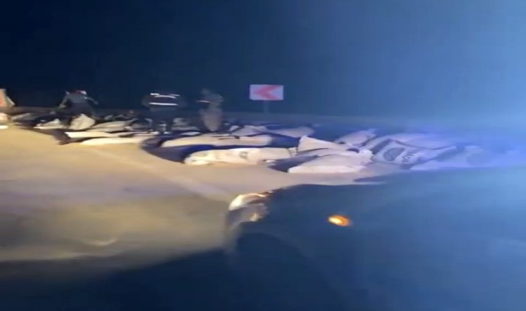 Elazığ’da seyir halindeki tırın dorsesinde yüklü yem çuvalları yola saçıldı.