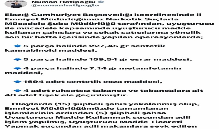 Elazığ Valisi Numan Hatipoğlu ise sosyal medya hesabından yaptığı paylaşım ile vatandaşların huzuru ve güvenliği için uyuşturucuyla mücadelenin kararlılıkla sürdürüleceğini vurguladı.