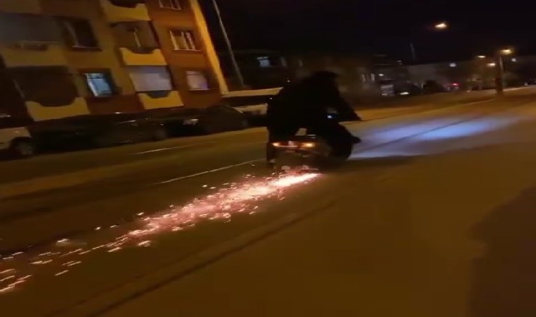 Eskişehir’de elektrikli bisikletlerinin park ayaklığıyla kıvılcımlar çıkartarak tehlikeli hareketler yapan gençler hem kendilerini hem de trafiği tehlikeye attı.
