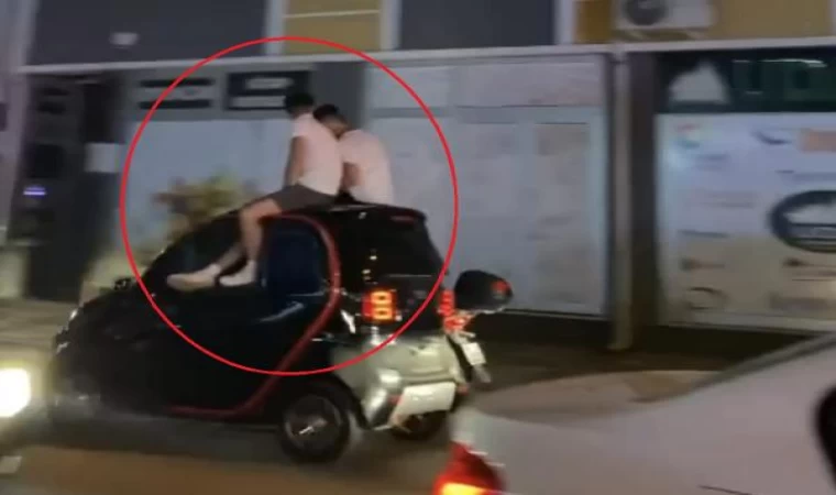 Kemalpaşa Mahallesi Adnan Menderes Bulvarı’nda 2 kişi, elektrikli otomobilin tavanına oturarak trafikte ilerledi. Bulvar üzerindeki tehlikeli yolculuk, çevredekiler tarafından cep telefonu kamerasıyla görüntülendi. Polis, olayla ilgili inceleme başlattı. (DHA)