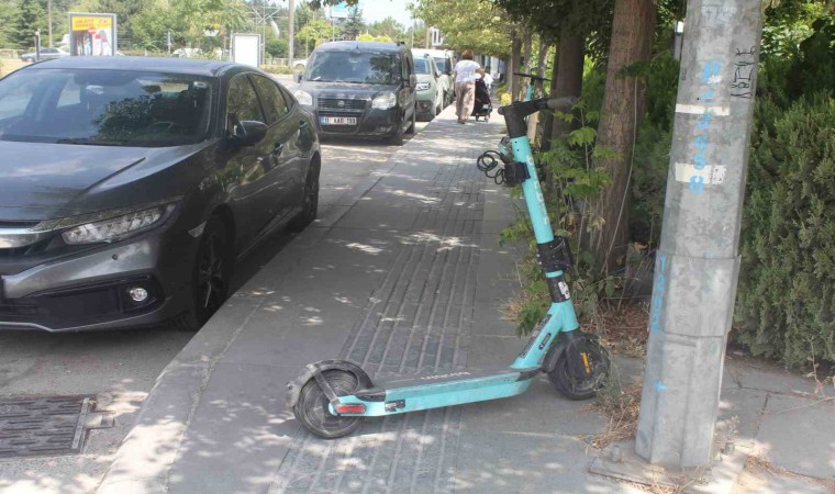 Tepebaşı ilçesi Hoşnudiye Mahallesi Doğruer sokakta bulunan elektrikli scooterların kaldırımdaki park şekilleri dikkatleri çekti. Ağaçlara gelişigüzel bağlanan elektrikli scooterların kaldırımdaki yaya geçişini zorlaştırdığı görüldü. Aracın tekerliğinin kaldırımdaki görme engelli yolunu da kapattığı gözlemlenirken, çevredeki bazı vatandaşlar engelli yolunun bu şekilde kapatılmasından dolayı rahatsızlıklarını dile getirdi. Vatandaşlar, düzensiz park edilişiyle çevreye kötü görüntü de sergileyen elektrikli scooter sürücülerinden daha duyarı olmaları gerektiğini belirttiler.