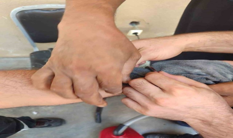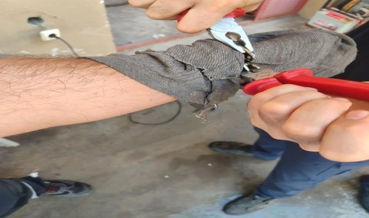 Hatay’da vatandaşın eline sıkışan kelepçe itfaiye tarafından kesilerek çıkartıldı.