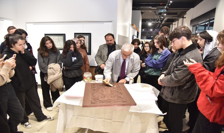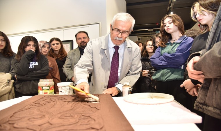 Sergi açılışı sonrasında Ahmet Kemal Saral, uygulamalı eserler hakkında sergiye katılan gençlerle özel olarak ilgilenip bilgi verdi.