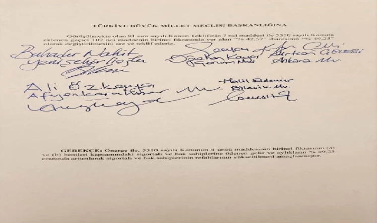 Önerge; AK Parti Manisa Milletvekili ve Grup Başkanvekili Bahadır Nahit Yenişehirlioğlu, Çorum Milletvekili Oğuzhan Kaya, Ankara Milletvekili Kurtcan Çelebi, Afyonkarahisar Milletvekili Ali Özkaya ve Bilecik Milletvekili Halil Eldemir imzasıyla hazırlandı. Önergeyle, Meclis Genel Kurulunda görüşülmekte olan 'İşsizlik Sigortası Kanunu ile Bazı Kanunlarda Değişiklik Yapılmasına Dair Kanun Teklifi'nin 7'nci maddesi ile 5510 Saylı Kanun'a eklenen geçici 102'nci maddenin birinci fıkrasında yer alan 'yüzde 42,57' ibaresinin 'yüzde 49,25' olarak değiştirilmesi teklif edildi. Hazırlanan önergeyle, 5510 Saylı Kanun'un 4'üncü maddesinin 1'inci fıkrasının a ve b bentleri kapsamındaki sigortalı ve hak sahiplerine ödenen gelir ve aylıkların yüzde 49,25 oranında artırılarak sigortalı ve hak sahiplerinin refahlarının yükseltilmesinin amaçlandığı belirtildi. Önerge, ilgili kanun teklifi dahilinde Genel Kurulda görüşülecek. (DHA)