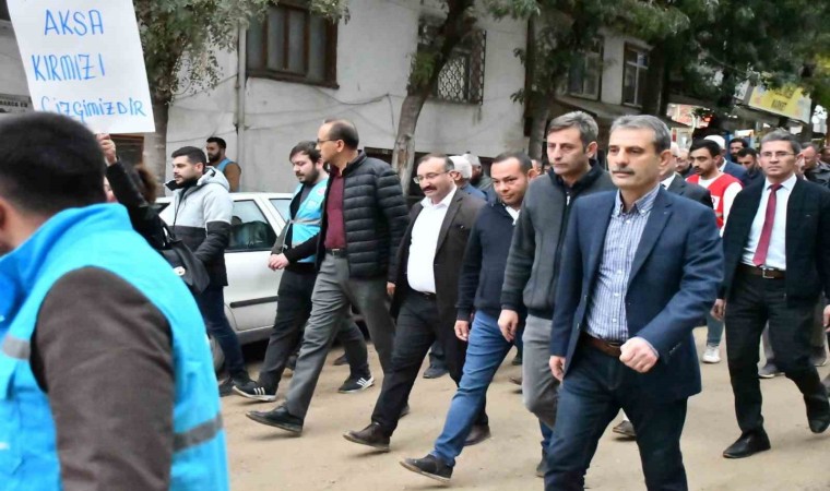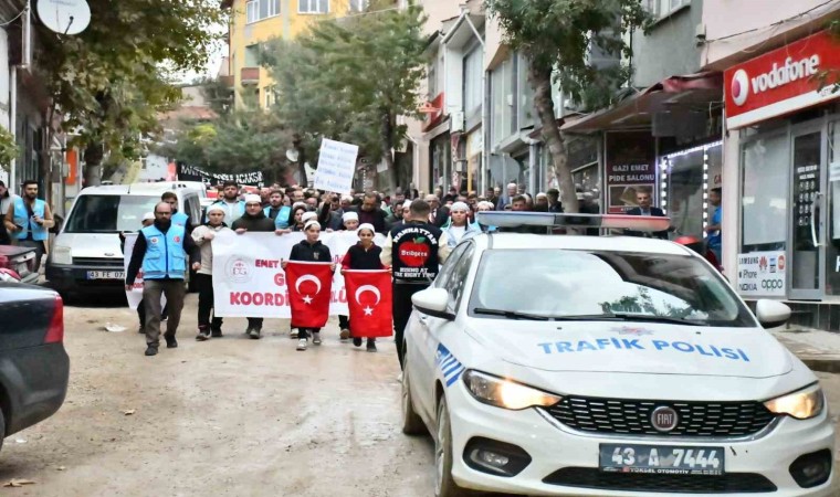 Ellerinde pankartlar ve Türk bayraklarıyla Emet Hükümet Meydanı’ndan başlayan yürüyüş, İsrail’i kınayan sloganlar ve tekbirler eşliğinde devam etti.