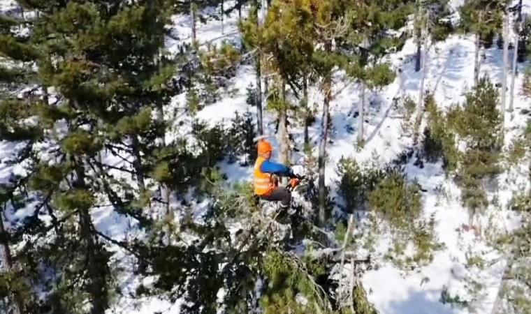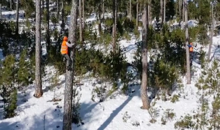 Emet Orman İşletme Müdürlüğüne bağlı ekipler 25-30 metre boyundaki ağaçlara tırmanarak karaçam gençliğine zarar vermemek için buduyorlar. Ormanın Sincaplarının budama çalışmaları dron ile havadan görüntülendi.
