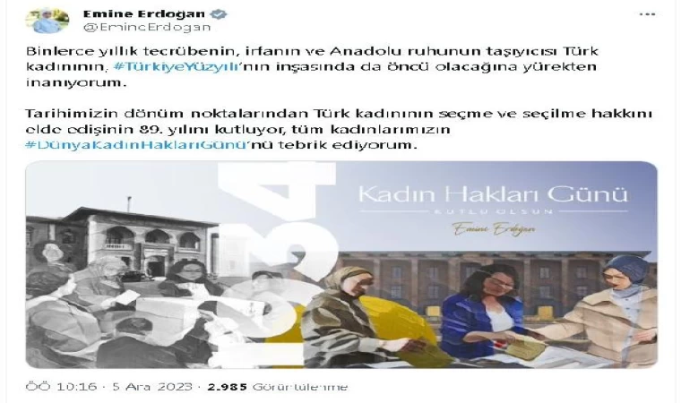 ANKARA, (DHA)- CUMHURBAŞKANI Recep Tayyip Erdoğan’ın eşi Emine Erdoğan, Türk kadınının seçme ve seçilme hakkını elde edişinin 89’uncu yıl dönümü ile 5 Aralık Dünya Kadın Hakları Günü’nü kutladı.