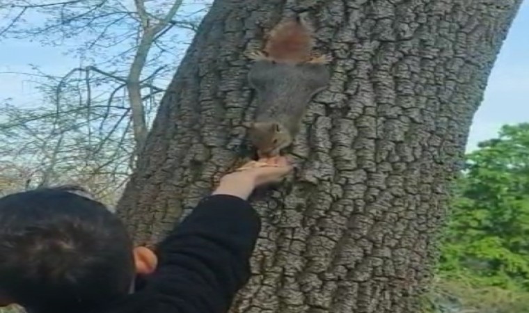 Emirgan Korusu’nda yaşayan sincabı elleriyle besleyen bir çocuğun babası, o anları cep telefonu kamerasıyla kaydetti. Çocuğun elindeki kuruyemişleri yiyen sevimli sincap renkli kareler oluşturdu.