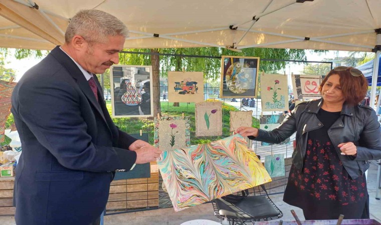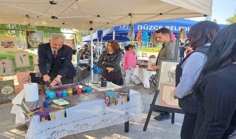 Sanat Sokağı’nda kadınların el emeği ve göz nuru ürünlerini inceleyen Düzce İl Emniyet Müdürü İbrahim Ergüder, burada ebru çalışması yaptı. Ergüder’in yaptığı ebru tablosu büyük beğeni topladı.
