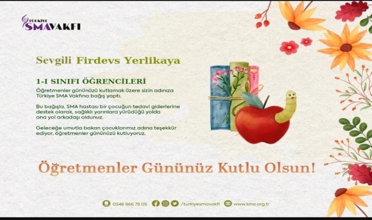 Mehmet Akif İlkokulu 1/I sınıfı velileri ve öğrencileri, 24 Kasım Öğretmenler Günü’nde farkındalık oluşturmak için anlamlı bir hediye düşündü. Öğretmen Firdevs Yerlikaya adına SMA Tip 1 hastası çocuklar için bağış yapıldı. Hediye karşısında büyük mutluluk duyan Firdevs Yerlikaya, hem velilere hem de öğrencilerine teşekkür etti.