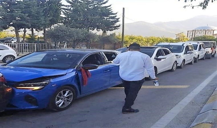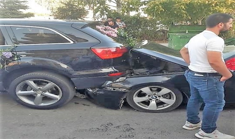 Öte yandan, düğün konvoyundaki 8 aracın birbirine girdiği zincirleme trafik kazası bölgedeki iş yerlerinin güvenlik kameralarına anbean yansıdı. Görüntülerde kameramanın bulunduğu hafif ticari aracın geçtikten sonra arkasından gelen otomobilin ani fren yaptığı ve gelin araması ile diğer araçların birbirine vurduğu anlar yer aldı.