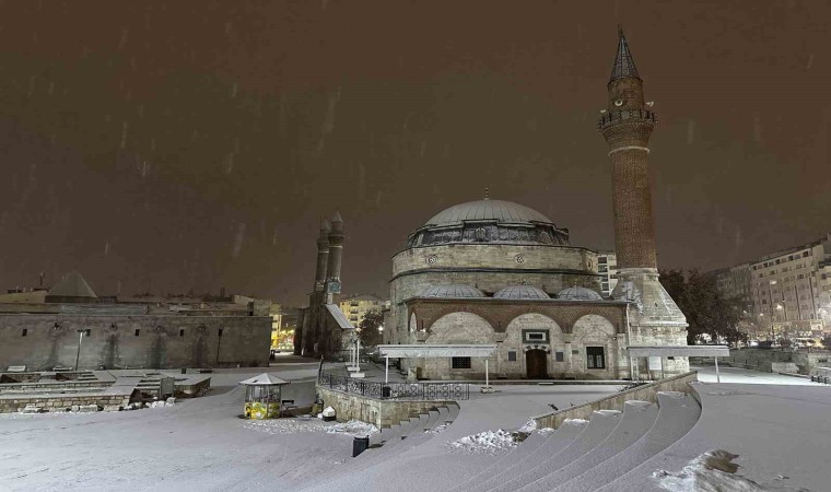 Sivas’ta en uzun gecede etkili olan kar yağışı tarihi kent meydanında masalsı görüntüler oluşturdu.