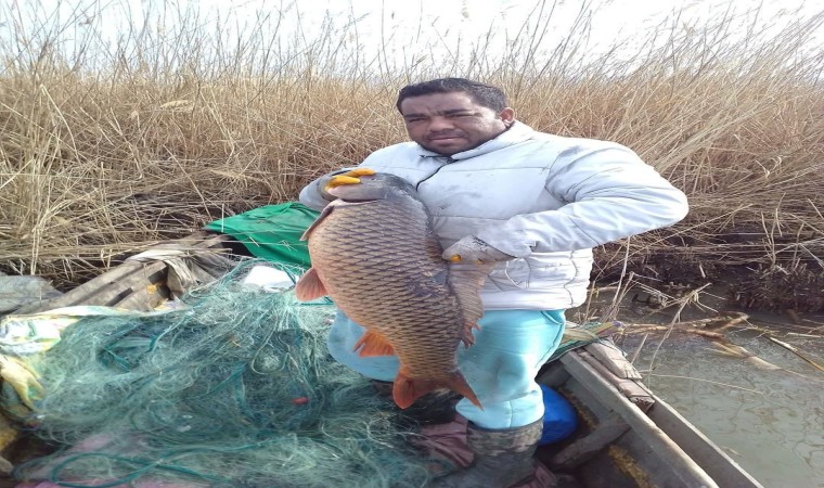 Edirne’nin Enez ilçesindeki Gala Gölü’nde 2 kardeş, attığı ağlar ile 18 kiloluk sazan balığı yakaladı.