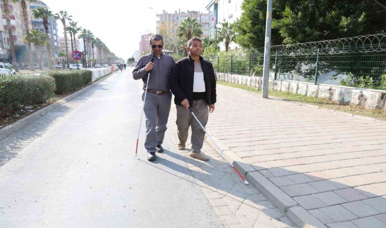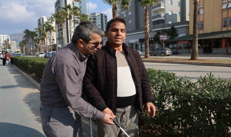 Adana’da doğuştan görme engelli Ahmet Ünal, 2 yıl önce görme yetisini yitiren Adem Kılınç’a beyaz baston eğitimi vererek sokakta yürümesini sağladı.