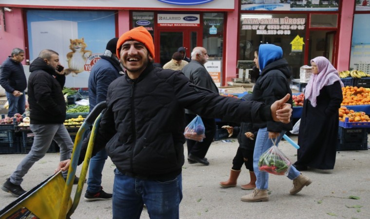 Pazarda günde 500 ile 700 lira arası kazandığını belirten Sünek, "İlk başladığımda iş kolay geliyordu. Daha sonraları, zaman geçtikçe ağır yüklerden dolayı belimde sıkıntı yaşamaya başladım. Sabahtan akşama kadar evlere el arabası ile torba taşıyorum. Uzak mesafeye de gidiyorum, yakın mesafeye de gidiyorum. Pazarın başında alıyorsam 30 liraya götürüyorum, sonlara doğru alıyorsam da 20 liraya götürüyorum. Ekmek paramı kazanıyorum" diye konuştu.