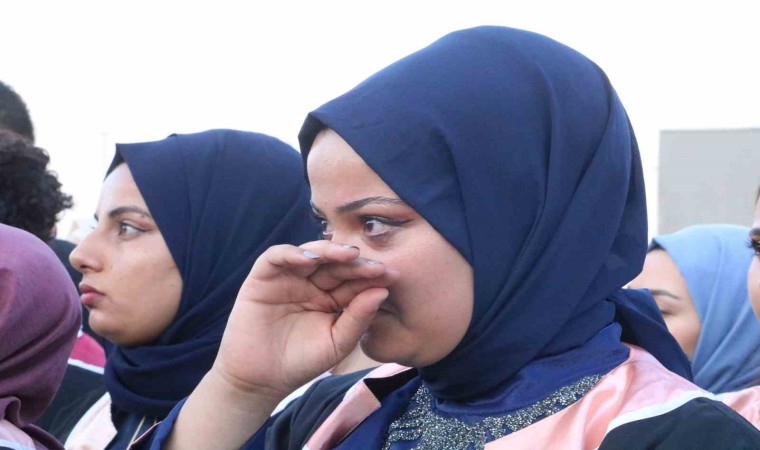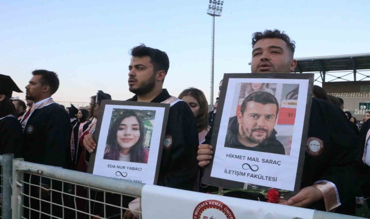 Depremin vurduğu Hatay’da üniversite öğrencileri, mezuniyet sevincini buruk yaşadı. Öğrenciler, mezuniyet törenine asrın felaketinde hayatını kaybeden arkadaşlarının fotoğraflarıyla katıldı.