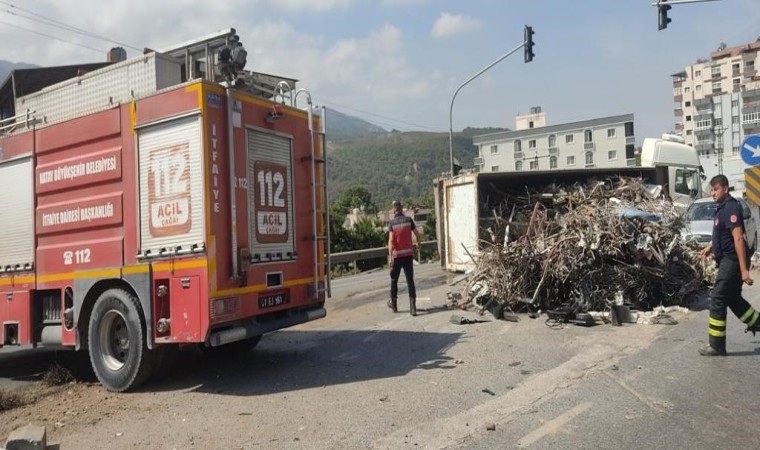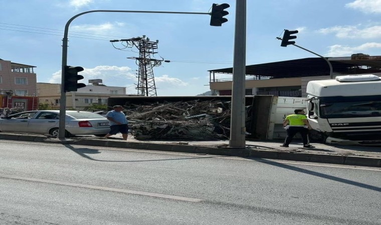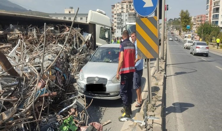 Hatay’da enkazdan çıkan demirleri taşıyan tırın devrildiği kazada, 4 araç zarar gördü.