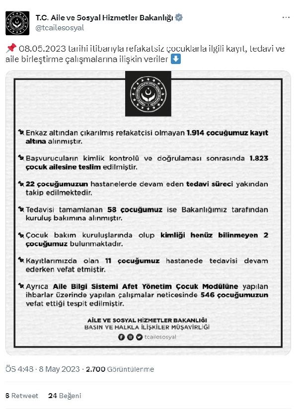 Enkazdan çıkarılan 1823 çocuk ailesine teslim edildi