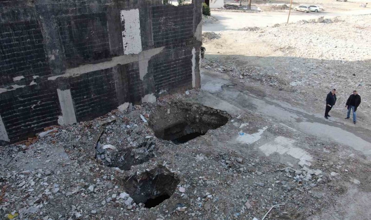 Hatay’da enkazı kaldırılan ağır hasarlı binanın temelinde obruk oluştu. Vatandaşların dikkatini çeken obruk, bölgede ilginç karşılandı.